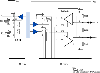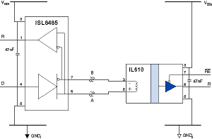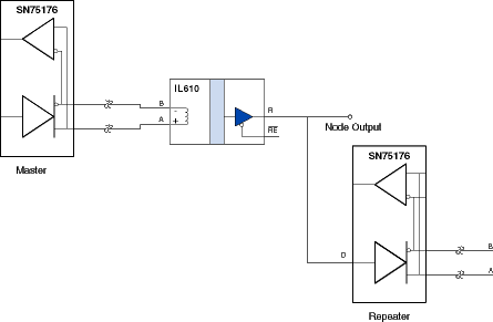 Simple, low cost, isolated repeater systems can be made with an RS-422 transmitter/receiver pair (or an RS-485 transceiver in drive mode) and an IL610. Repeaters can extend the useful cable length and node count indefinitely, provided the network controller can tolerate the additional propagation delays.