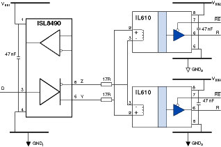 This circuit shows a two-receiver RS-422 network using IL610s. Two 17 Ohm current-limiting resistors prevent two IL610 coils from exceeding the maximum load of the transceiver chip. Placement of the current-limiting resistors on both lines provides better dynamic signal balance.